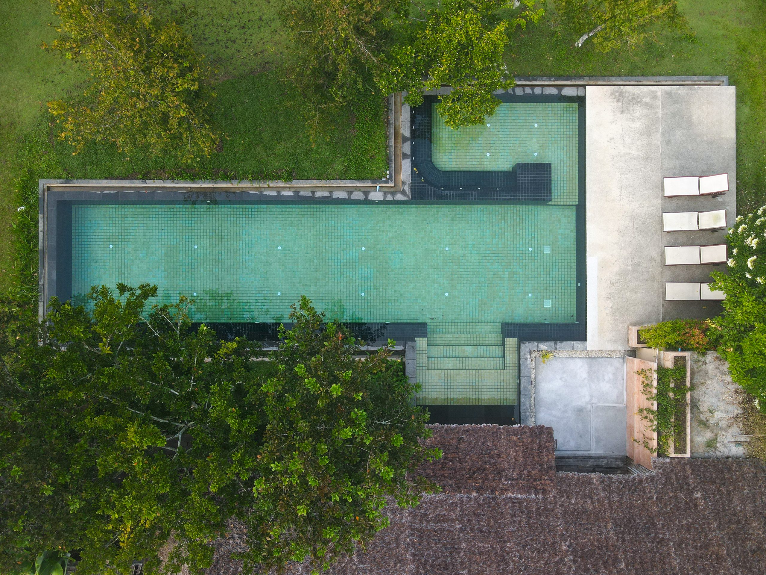 The natural green-tiled surface reflects the mountains and trees around it, creating a soothing visual experience from the moment you arrive. The spacious poolside area, complete with comfortable loungers, provides the perfect setting for slow mornings, refreshing afternoon swims, or quiet evenings immersed in nature.